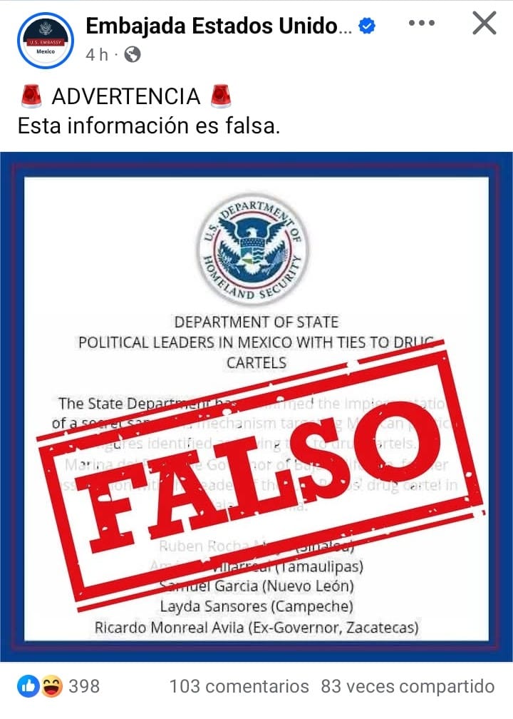 Por cierto, hoy también la página de FB de la Embajada de los Estados Unidos desmintió la presunta lista de un supuesto operativo de sanciones contra gobernadores mexicanos presuntamente relacionados con el crimen organizado.