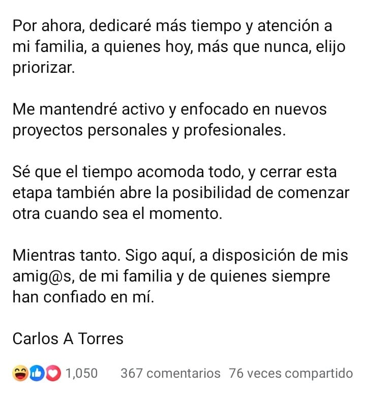 • Carlos Torres pone distancia de la política, anunció que dejará los cargos honorarios que ostentaba